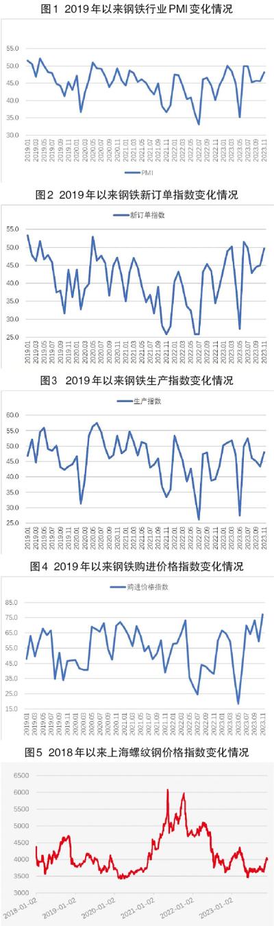 从中物联钢铁物流专业委员会调查、发布的钢铁行业PMI(采购经理指数)来看,2023年11月份为48.2%,环比上升2.6个百分点,结束了连续3个月在45%左右运行的态势,显示钢铁行业运行短期内有所趋稳。分项指数变化显示,市场需求有所回暖,钢材生产相应回升,原材料价格再度上涨,钢材价格震荡上升。预计12月份,随着天气进一步转冷,需求端将有所收缩,原材料价格震荡下降,钢材价格高位回落,钢厂生产再度下降。
