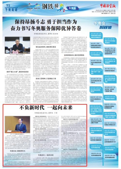 在冬奥会筹办的赛场中,中国钢铁赛出了好成绩、亮出了好形象,让亿万中国人民再次见证钢铁行业的担当与奉献,让世界重新认识更加有为的钢铁、更加友爱的钢铁。