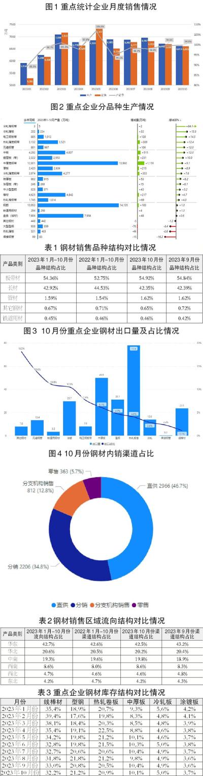 10月份,全国粗钢产量为7909万吨,同比减少1.8%。钢材产量为11371万吨,同比增长3%。其中,纳入营销月报的重点统计钢铁企业(以下简称重点企业)钢材产量为6615万吨,同比减少0.25%;销售钢材6606万吨,同比增长0.53%,10月份产销率进一步上升至99.9%。