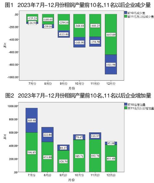2023年粗钢产量前10名企业(产量≥1944.75万吨)合计同比增加644.42万吨,增幅为1.55%,产量占重点企业总产量的51.16%,同比减少0.66个百分点。其中有4家年产量同比减少,同比减少347.65万吨,降幅为3.22%,产量占重点企业总产量的12.67%,同比下降0.80个百分点;有6家企业年产量同比增加,同比增加992.07万吨,增幅为3.23%,产量占重点企业总产量的38.49%,同比增加0.14个百分点。