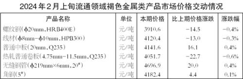 本报讯据国家统计局对全国流通领域9大类50种重要生产资料市场价格的监测显示,2月上旬与1月下旬相比,20种产品价格上涨,25种下降,5种持平。其中,6大黑色金属类产品本期价格三升三降。