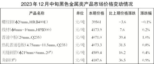 本报讯据国家统计局对全国流通领域9大类50种重要生产资料市场价格的监测显示,2023年12月中旬与12月上旬相比,29种产品价格上涨,19种下降,2种持平。其中,6种黑色金属类产品本期价格环比五升一降。