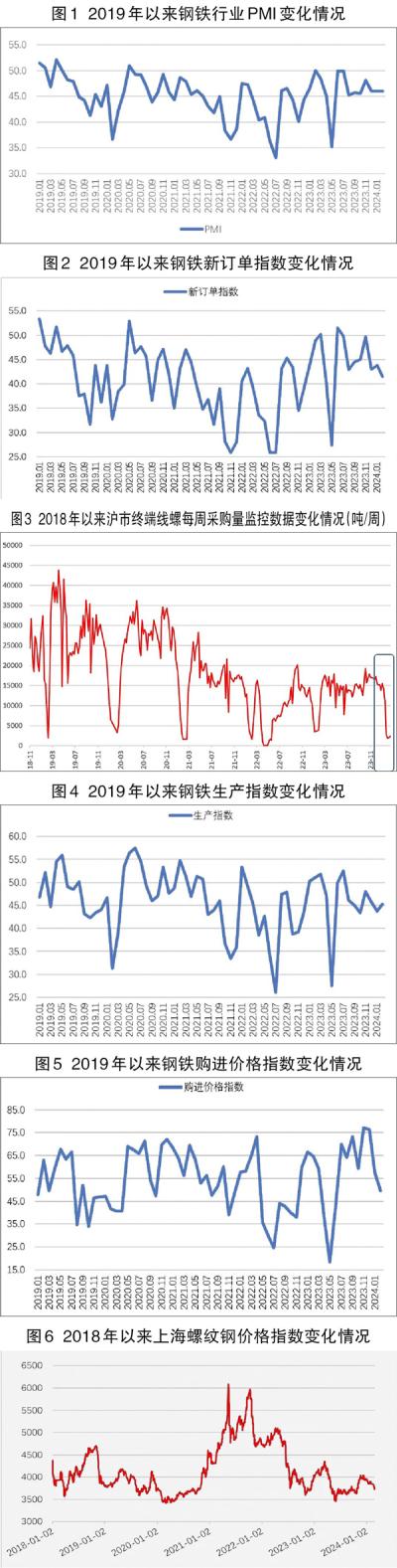 从中物联钢铁物流专业委员会调查、发布的钢铁行业PMI(采购经理指数)来看,2月份为46%,与1月份持平。分项指数显示,受春节假期影响,钢铁行业淡季特征仍然较为明显,钢材市场需求继续下滑,但钢材生产相对平稳,钢材库存有所增加,原材料价格明显下降,钢材价格震荡下行,钢市整体继续偏弱运行。预计3月份,钢材需求或弱势恢复,钢厂生产有所增长,原材料价格持续下降,钢材价格震荡下行。