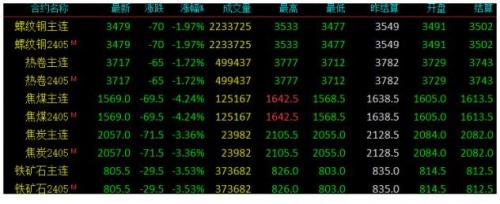 27日黑色系螺纹钢主力跌70,收报3479,跌幅1.97%;热卷主力跌65,收报3717,跌幅1.72%;焦煤主力跌69.5,收报1569,跌幅4.24%;焦炭主力跌71.5,收报2057,跌幅3.36%;铁矿石跌29.5,收报805.5,跌幅3.53%。
