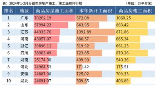 房地产开发投资情况来看,21个省市投资额突破百亿,1-2月投资额分别为1629.68亿元、1508.14亿元和1416.84亿元,投资额均在千亿以上。31省市1-2月的商品房屋施工面积共666901.62万平方米。1-2月房屋新开工面积共9428.94万平方米,1-2月全国房地产开发投资累计同比继续下降。