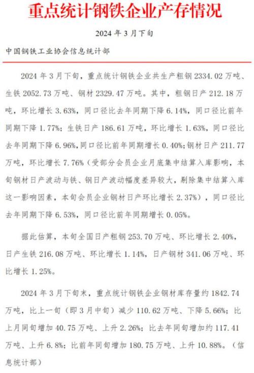 据中钢协数据显示,2024年3月下旬,重点统计钢铁企业粗钢日产212.18万吨,环比增长3.63%,同口径比去年同期下降6.14%。3月下旬末,重点统计钢铁企业钢材库存量约1842.74万吨,比上一旬(即3月中旬)减少110.62万吨、下降5.66%;比上月同旬增加40.75万吨、上升2.26%。