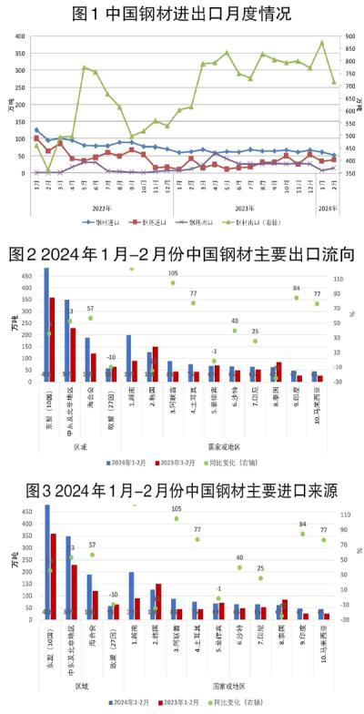 2024年以来,国内钢铁业受下游有效需求不足及春节假期后需求启动缓慢等因素影响,钢材库存增加,价格承压下行,企业效益下滑。而境外钢材价格表现相对坚挺,我国企业出口动力较强,进口需求不足,钢材进出口延续2023年走势,出口保持高位,进口持续回落。需警惕的是,由于前期钢材特别是中低端产品出口量大幅增加,目前贸易摩擦案件数量呈现增长态势,出口企业要加强自律,规范出口秩序。