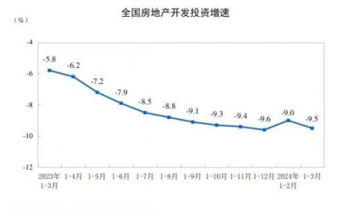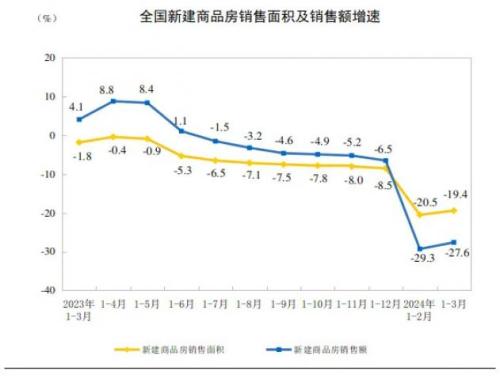 2、国家统计局发布数据显示,1—3月份,全国房地产开发投资22082亿元,同比下降9.5%(按可比口径计算);其中,住宅投资16585亿元,下降10.5%。1—3月份,新建商品房销售面积22668万平方米,同比下降19.4%,其中住宅销售面积下降23.4%。新建商品房销售额21355亿元,下降27.6%,其中住宅销售额下降30.7%。