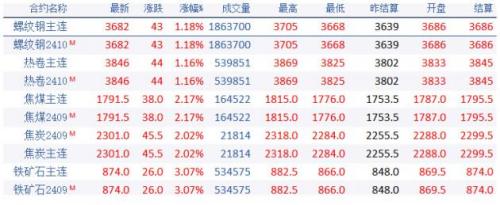 18日黑色系螺纹钢主力涨43,收报3682,涨幅1.18%;热卷主力涨44,收报3846,涨幅1.16%;焦煤主力涨38,收报1791.5,涨幅2.17%;焦炭主力涨45.5,收报2301,涨幅2.02%;铁矿石涨26,收报874,涨幅3.07%。