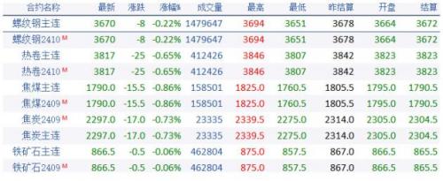 22日黑色系螺纹钢主力跌8,收报3670,跌幅0.22%;热卷主力跌25,收报3817,跌幅0.65%;焦煤主力跌15.5,收报1790,跌幅0.86%;焦炭主力跌17,收报2297,跌幅0.73%;铁矿石跌0.5,收报866.5,跌幅0.06%。