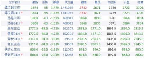 8日黑色系螺纹钢主力跌55,收报3674,跌幅1.47%;热卷主力跌63,收报3808,跌幅1.63%;焦煤主力跌88,收报1777.5,跌幅4.72%;焦炭主力跌94,收报2311,跌幅3.91%;铁矿石跌26,收报866,跌幅2.91%。