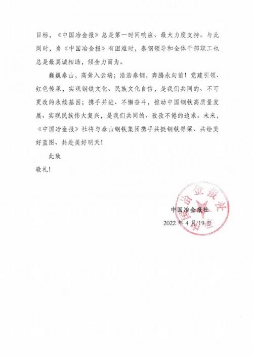 党建引领、红色传承,实现钢铁文化、民族文化自信,是中国冶金报社与泰山钢铁集团共同的、不可更改的永续基因;携手并进、不懈奋斗,推动中国钢铁高质量发展、实现民族伟大复兴,是双方共同的、孜孜不倦的追求。未来,中国冶金报社将与泰山钢铁集团携手共挺钢铁脊梁、共绘美好蓝图、共赴美好明天!