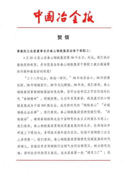 信中提到,38年来,泰山钢铁集团勇做钢铁强国的急先锋,坚守由老书记王守东创造的红色“泰钢精神”,顽强拼搏,从当年负债累累、残败废旧的小钢联发展成为中国500强企业,成为新时代的“钢铁泰山”“卓越钢铁企业品牌”;坚持党建引领,“四轮驱动”,确保泰钢始终走在中国特色社会主义的康庄大道上;勇做高质量发展的排头兵,在高端品种研发上下硬功夫,多项技术填补国内空白,创造中国钢铁工业史上多项第一;勇做绿色低碳发展的时代弄潮儿,实施世界首例钢铁行业烟气协同治理项目,树立绿色低碳、循环经济环保项目典范,成为国家第一批“绿色工厂”;勇做心系职工和承担社会责任的实干家,丰富职工各类活动,关爱职工身心健康,并持续开展扶危济贫和脱贫攻坚,各类捐款达数亿元……
