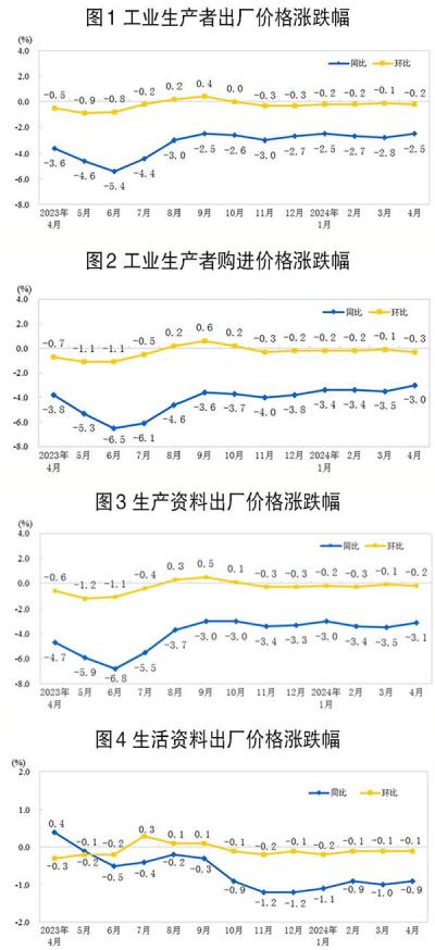 4月份,工业生产者出厂价格中,生产资料价格同比下降3.1%、环比下降0.2%。影响工业生产者出厂价格总水平同比下降约2.32个百分点、环比下降约0.17个百分点。其中,采掘工业价格同比下降4.8%、环比下降1.0%,原材料工业价格同比下降1.9%、环比上涨0.3%,加工工业价格同比下降3.6%、环比下降0.4%。生活资料价格同比下降0.9%、环比下降0.1%。影响工业生产者出厂价格总水平同比下降约0.22个百分点、环比下降约0.03个百分点。其中,食品价格同比下降0.8%、环比下降0.1%,衣着价格同比上涨0.3%,一般日用品价格同比上涨0.1%、环比上涨0.3%,耐用消费品价格同比下降1.9%、环比下降0.5%。