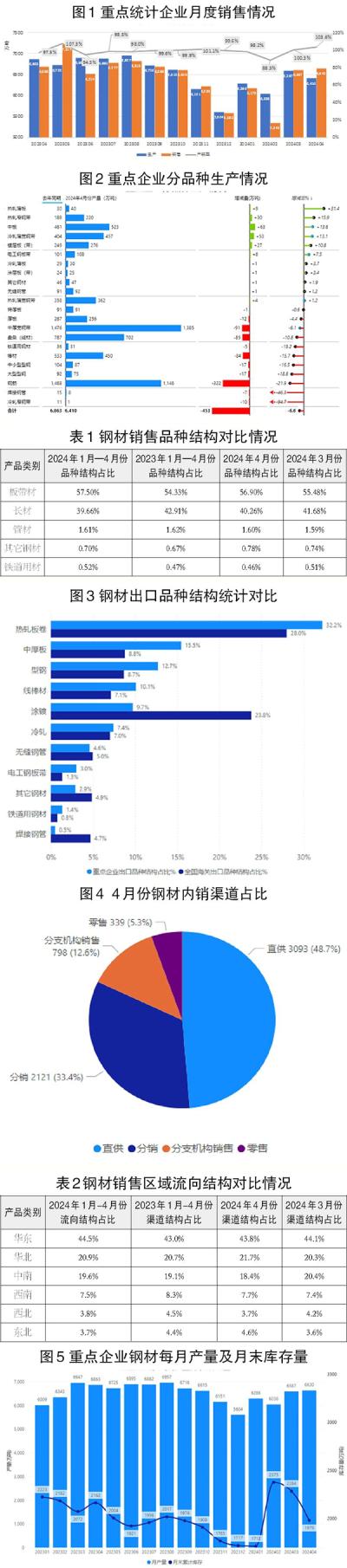 4月份,重点企业内销钢材量为6352万吨,内销占比为95.64%,其中,直供渠道、分销渠道、分支机构销售渠道、零售渠道分别占比分别为48.7%、33.4%、12.6%、5.3%。