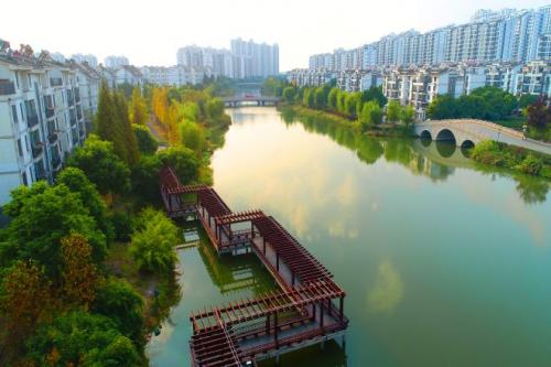 河西岸,江南农耕文化主题公园内翠色掩映,鸟雀成群,远处小桥流水,亭台楼阁,与别具江南风情的现代化农民集中居住区构成了一幅充满诗意的画卷。