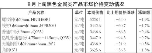 本报讯据国家统计局对全国流通领域9大类50种重要生产资料市场价格的监测显示,8月上旬与7月下旬相比,9种产品价格上涨、36种下降、5种持平。其中,6种黑色金属类产品本期价格环比均下降。