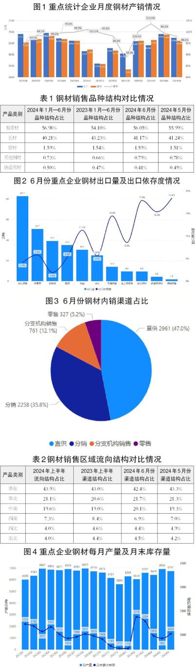 6月份,全国粗钢、钢材产量分别为9161万吨、12555万吨,同比分别增长0.2%、3.2%。纳入营销月报的重点统计钢铁企业(以下简称重点企业)钢材产量为6741万吨,同比下降2.4%。重点企业钢材销售量为6608万吨,同比增长1.2%。6月份钢材产量增速环比略有下降。从环比数据看,产销两端均有所下降,但销量下降更为明显。当前市场需求依然不足,销售压力进一步加大,6月份的产销率下滑至98%,库存水平也开始回升。