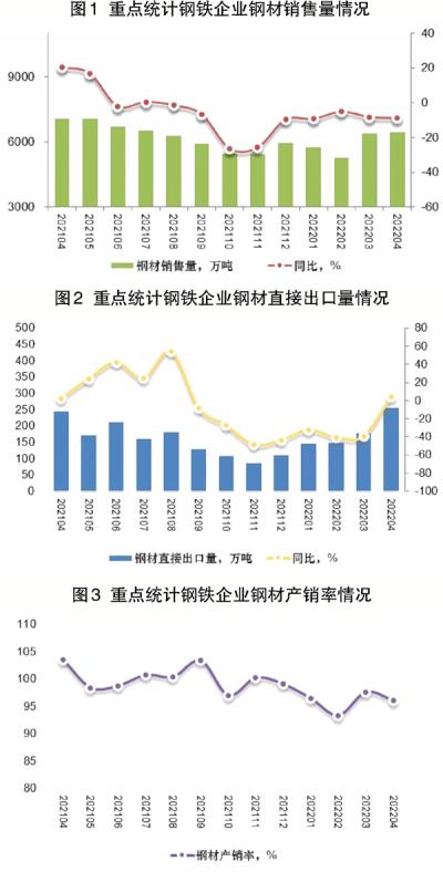 上述统计数据表明:受部分地区新冠肺炎疫情防控形势趋紧、需求增长延迟、物流交通受阻等多重因素叠加影响,重点统计钢铁企业钢材销售同比连续9个月下降,但钢铁消费指标的月度环比数据呈回升态势,日销量环比连续3个月上升,供需基本均衡。4月份,钢材直接出口量环比上升43.99%,增幅进一步扩大,近5个月呈增长态势;钢材直接出口量同比由降转增。钢材产销率由升转降,鉴于新冠肺炎疫情反弹、经济下行压力加大等多重因素对需求端的影响,钢铁供需变化仍需密切跟踪和关注,以实现供需动态平衡。