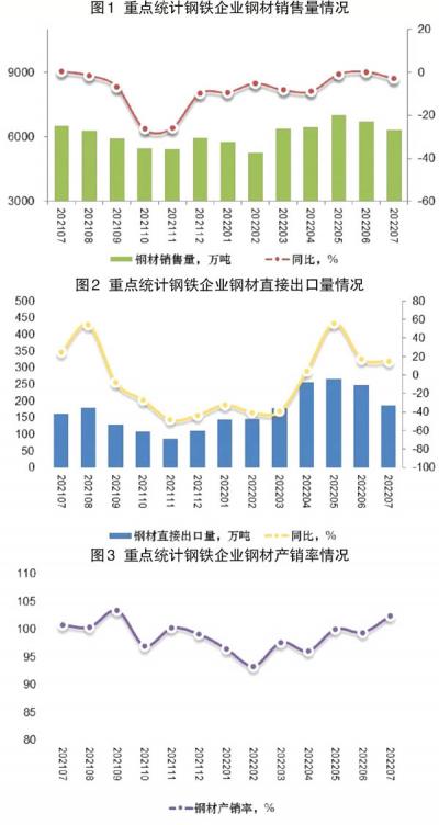 据营销月报统计,7月份,重点统计钢铁企业销售钢材6347.67万吨,同比下降2.88%;钢材日销水平为204.76万吨/日,日销环比下降8.71%,钢材产销率102.41%,环比上升2.99个百分点,同比上升1.68个百分点。其中,国内销售钢材6162.54万吨,同比下降3.33%,直接出口钢材185.13万吨,环比下降25.22%,同比上升15.10%。