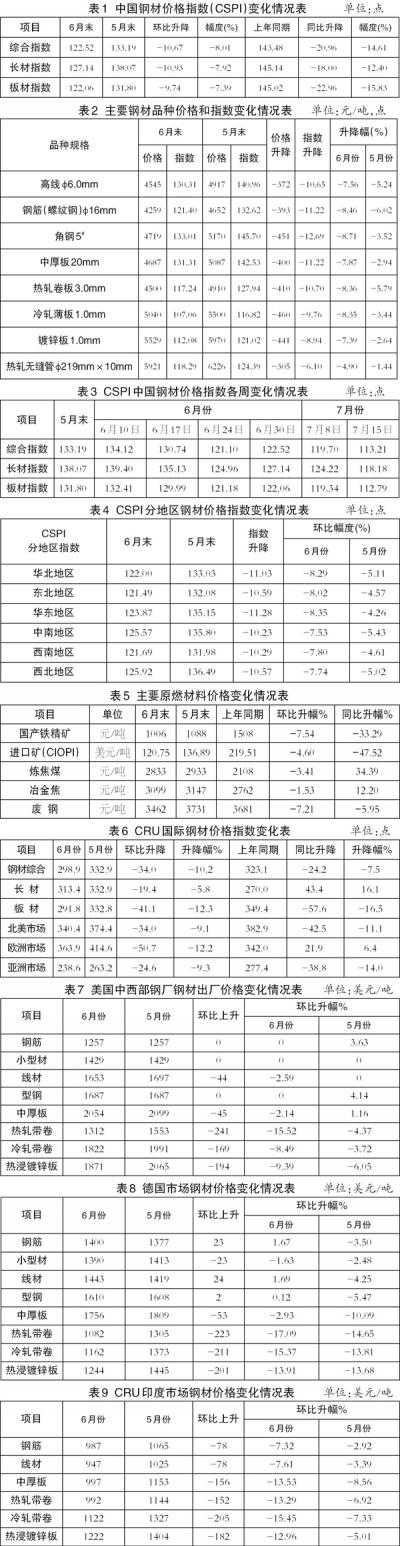 6月份,国家稳增长政策措施陆续出台并相继落地,但钢材需求形势仍不及预期,钢铁产量环比减少,原燃料价格有所回落,钢材价格也有所下降。进入7月份以来,钢材价格继续呈小幅下降走势。