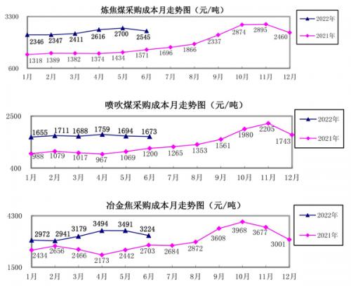 2022年1月—6月份,炼焦煤采购成本累计同比增长76.60%,冶金焦同比增长29.24%;国产铁精矿同比下降21.22%,进口粉矿同比下降24.46%;废钢同比增长7.48%。