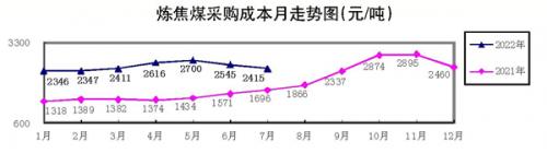 7月份,对标企业炼焦煤加权平均折算成干基的采购成本为2414.66元/吨,环比下降130.76元/吨,降幅为5.14%。1月—7月份,炼焦煤累计平均折算成干基的采购成本为2481.60元/吨,同比升高1029.76元/吨,升幅为70.93%。