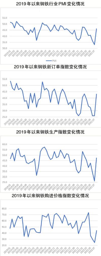 从中物联钢铁物流专业委员会调查、发布的钢铁行业PMI来看,2022年8月份为46.1%,环比回升13.1个百分点,显示钢铁市场连续收紧态势有所放缓,行业运行有所恢复。从分项指数变化来看,市场需求下行趋势有所放缓,钢厂生产有所恢复,但供需两端仍保持偏弱格局,钢材价格小幅回升,原材料价格止跌反弹。预计9月份,钢材需求继续改善,但改善空间或将有限,钢厂生产保持回升,钢材价格或将小幅震荡。