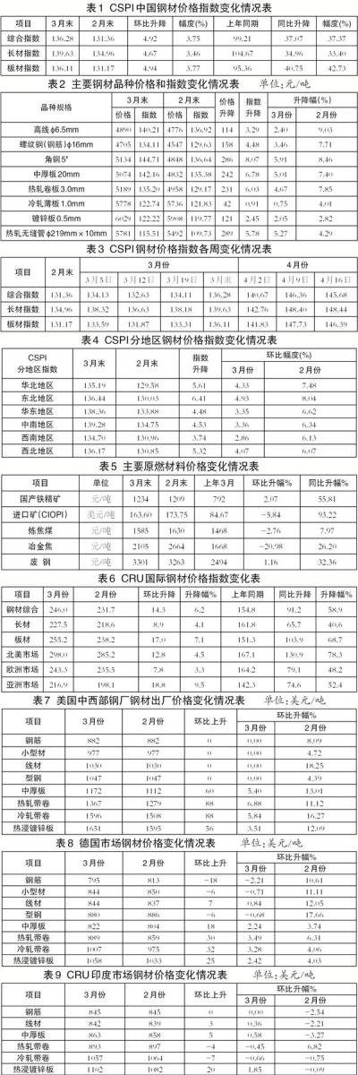 3月份,国内市场需求旺盛,钢材价格波动上行,升幅较2月份有所加大。进入4月份以来,钢材价格先升后降,总体延续波动上行走势。