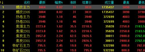 5日螺纹钢主力涨31,收报3804,涨幅0.82%;热卷主力涨46,收报3940,涨幅1.18%;焦煤主力涨35.5,收报2223,涨幅1.62%;焦炭主力涨62.5,收报2857,涨幅2.24%;铁矿石涨19,收报795.5,涨幅2.45%。