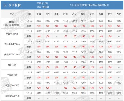 钢市影响因素 统计局:11月份国民经济运行总体延续恢复态势 农业生产形势较好,粮食产量再创新高;二、工业生产持续增长,高技术制造业增长较快;三、服务业生产放缓,现代服务业增势较好;四、市场销售略减,基本生活类商品销售和网上零售较快增长;五、固定资产投资规模继续扩大,高技术产业投资较快增长;六、货物进出口保持增长,贸易结构继续优化;七、就业形势基本稳定,城镇调查失业率略有上升;八、居民消费价格同比涨幅回落,工业生产者价格同比下降。 分析师观点:随着疫情防控政策调整,市场物流运输通畅,加上新的领导班子成立,稳定经济发展成为首要任务,各项政策举措逐步落地,国民经济保持恢复态势,资本投资规模继续扩大,市场价格总体平稳,新动能持续成长,同时国内消费力不断扩大,对钢材需求量加大,利好钢材价格走势。 统计局:11月中国粗钢日产248.47万吨,环比降3.4% 2022年11月,中国粗钢日均产量248.47万吨,环比下降3.4%;生铁日均产量226.63万吨,环比下降0.8%;钢材日均产量363.97万吨,环比下降1.8%。11月,中国粗钢产量7454万吨,同比增长7.3%;生铁产量6799万吨,同比增长9.7%;钢材产量10919万吨,同比增7.1%。 分析师观点:从统计数据可以看出,由于10月份国庆假期及疫情管控影响,钢企生产进度受到影响。随着疫情形势好转,11月份粗钢、生铁、钢材产量增长,但进入淡季后,项目进度受限,终端采购需求下降,加上铁矿石及焦炭价格连续拉涨,成本端维持高位,钢企亏损增加,钢厂停产检修增多,11月粗钢、生铁、钢材日均产量环比下降,市场供应量走弱,利好钢价反弹。 美联储如期加息50个基点 美联储在今年最后一次议息会议上如期加息50个基点,基准利率提升至4.25%-4.5%的十五年新高,并重申继续加息“可能”适宜。此外,“点阵图”将明年终端利率上调至5.1%,略超市场预期,并预言2024年之前利率保持高位、不会降息。 分析师观点:15日凌晨3点,美联储公布加息50个基点,2022年最后一次加息落地,比较符合市场预期,美元价格应声下降,大宗商品价格再度拉涨,同为大宗商品的铁矿石价格继续升高,钢企生产成本再度加大,多数钢企亏损增加,停产检修或将增多,钢材市场供应量有望下降,部分规格或将缺货,助力钢价上涨。 央行开展6500亿元MLF操作,加大操作规模 12月15日,央行公告称,为维护银行体系流动性合理充裕,2022年12月15日人民银行开展6500亿元中期借贷便利(MLF)操作和20亿元公开市场逆回购操作,充分满足了金融机构需求。 分析师观点:随着疫情形势改变,经济下行压力较大,央行引导金融机构加大对实体经济支持力度,助力宽信用,降低实体企业融资成本,此次央行加量续作,旨在加大对市场的中长期流动性投放,将有助于稳定市场预期,平稳跨年流动性运行,提振市场投资预期,扩大钢材需求量,利好钢价。 市场价格 期货大幅拉涨 15日新加坡铁矿石掉期指数合约重新站上111美元/吨,带动国内铁矿石、期螺大涨超3%,螺纹钢主力涨131,收报4084,涨幅3.31%;热卷主力涨107,收报4149,涨幅2.65%;焦煤主力涨39,收报1997.5,涨幅1.99%;焦炭主力涨58,收报2904.5,涨幅2.04%;铁矿石涨26,收报830,涨幅3.23%。 钢厂大部分上涨 据中钢网资讯研究院数据显示,今日共27家钢厂调价,其中: 上调21家,占比77.8%,调价幅度20-60元/吨; 持平6家,占比22.2%。 秦皇岛卢龙地区普方坯价格再涨30,执行3810元含税出厂,累涨80。 现货上涨 中钢网APP数据显示: 建材24个市场中,23个市场涨10-80,螺纹钢20mmHRB400E平均价格4028元/吨,较上个交易日价格涨38元/吨; 热卷24个市场中,24个市场涨10-60,4.75热轧板卷平均价格4148元/吨,较上个交易日价格涨40元/吨; 中厚板23个市场中,21个市场涨10-50,14-20mm普中板平均价格4185元/吨,较上个交易日涨26元/吨。 钢价预测 中共中央、国务院印发《扩大内需战略规划纲要(2022-2035年)》指出,必须坚定实施扩大内需战略,不断释放内需潜力,充分发挥内需拉动作用,建设更加强大的国内市场,国家扩大内需战略再启,增加钢材需求量,多重利好支持钢价坚挺,同时铁矿石再度大涨,钢企亏损程度加大,停产检修增多,挺价心理较强,目前现货市场情绪整体回升,交易情绪偏积极,但考虑到淡季深入,终端需求跟进或显疲态,钢贸商注意防高位回落风险,预计短期内钢材价格或稳中偏强运行。