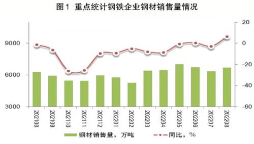 据中国钢铁工业协会重点统计钢铁企业钢材营销月报统计,8月份,重点统计钢铁企业销售钢材6697.02万吨,比去年同期上升6.30%;钢材日销量为216.03万吨,日销量环比上升5.50%;钢材产销率为100.87%,环比下降1.54个百分点,同比上升0.46个百分点。其中,国内销售钢材6545.59万吨,比去年同期上升6.96%;直接出口钢材151.44万吨,环比下降18.20%,比去年同期下降16.07%。