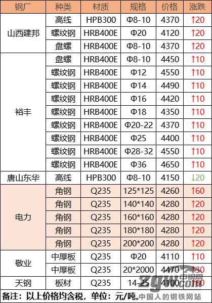 钢厂调价汇总