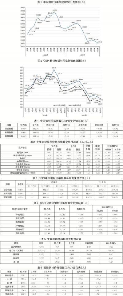 10月份,CSPI综合指数总体呈窄幅波动下行走势,各周价格指数基本上在110点上下波动;进入11月份以来,第一周钢材价格继续下降,第二周、第三周小幅回升。