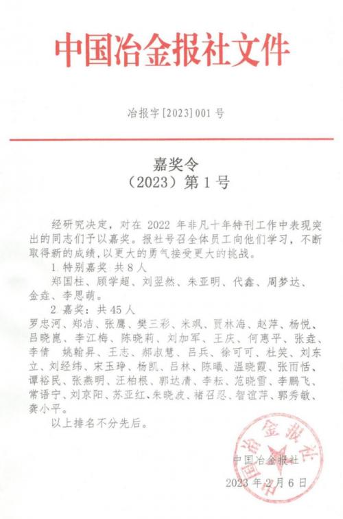 在宣读百版特刊嘉奖令时,陈玉千表示,2022年,为庆祝党的二十大胜利召开,报社组织了非凡十年庆祝特刊。特刊以100块版的重磅规模,以领航、寄语、心声、答卷、印记、瞬间、收获、笃行为主题,详实记录了这十年来习近平总书记与中国钢铁的故事,重现了钢铁行业的高光时刻与精彩瞬间,总结了中国钢铁业在党的建设、供给侧结构性改革、联合重组、绿色发展、科技创新、智能制造、高水平开放、产业链现代化、脱贫攻坚、抗击疫情等10个方面取得的辉煌成就,图文并茂展示了多家钢铁企业的奋斗历程与优秀成绩,还刊登了来自钢铁行业的党的二十大代表和钢铁行业先锋模范的寄语与心声,全方位、多角度的报道增加了特刊的深度与厚度,是钢铁行业这十年发展成就的重要集锦。此次特刊,版面之多、组版难度之大、要求之高、参与人数之多创造了报社成立67年来各项数据之最。报社上下同欲,各部门、各岗位人员在报社党委的正确领导下,坚守舆论阵地,坚持正确的政治导向,积极参加,分工明确、相互配合,责任到人,充分体现了无私奉献、精诚合作的优良传统,经过前后一个月的日夜奋战,最终圆满成刊。