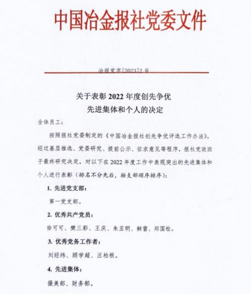 2月3日上午,中国冶金报社会议室气氛热烈,掌声不断。在这里,中国冶金报社2022年度创先争优表彰大会隆重召开,对在“非凡十年*庆祝二十大”百版特刊工作中表现突出的同志们进行嘉奖,对获得报社2022年度创先争优的先进集体和优秀个人进行表彰。