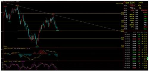 I2401合约重心下移,但相对抗跌,铁矿石主力合约周三呈低开高走状态,截至午后收盘涨幅0.07%,收于723元/吨,日K上方阻力730元,下方支撑700元,目前底部回落筑底不明显,后市上行阻力较大,技术上,I2401合约1小时MACD指标显示DIFF与DEA运行于0轴下方。操作上建议,反弹择机短空,注意风险控制。