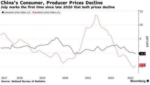 在中国6月消费者物价指数(CPI)回落至零后,最新数据显示,中国7月CPI下跌0.3%,为2021年1月以来最低水平,显示出现轻微通缩迹象,生产者物价指数(PPI)则下降4.4%,连续第10个月下降,但降幅较6月的5.4%小,暗示出现触底信号。
