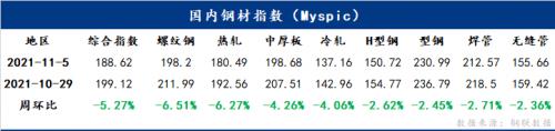 5日国内钢材指数(Myspic)综合指数报188.62点,周环比下跌5.27%。螺纹指数198.2,周环比下跌6.51%;热卷指数180.49,周环比下跌6.27%;中厚板指数198.69,周环比下跌4.26%;冷板指数137.16,周环比下跌4.06%。