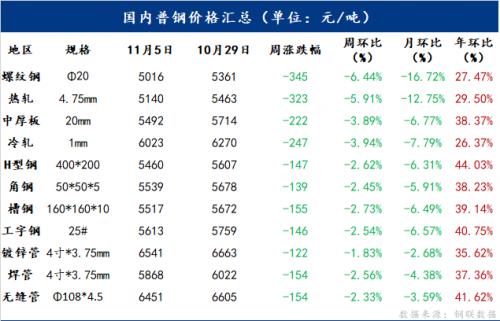 焊管:本周国内焊管市场价格迎来断崖式下跌,库存减少至近四个月以来低位水平。据盘点数据显示:截至11月5日全国27个主要城市4寸*3.75mm焊管平均价格为5868元/吨,与29日平均价格6022元/吨跌154元/吨。库存方面:全国焊管11月5日库存为88.75万吨,较29日90.45万吨降低1.7万吨。期货方面,本周黑色系期货大幅杀跌,影响现货市场交投心态,临近冬季,下游需求萎靡,整体成交欠佳。原料方面,坯带价格下行对管价支撑作用偏弱,管厂消耗高价带钢库存,管价弹性回落,仍有较大回落空间。综上,预测下周全国焊管价格将继续弱势运行。