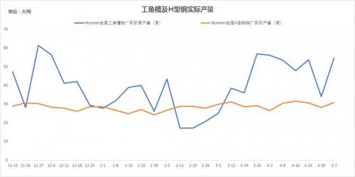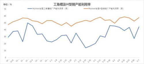 本周全国工角槽开工率较上周增加18.3%,产能利用率增加16.81%;全国H型钢开工率较上周增加10.65%,产能利用率同步增加5.1%。全国工角槽钢钢厂厂内库存总量为70.77万吨,周环比减少3.94万吨;全国H型钢厂厂内库存总量为19.65万吨,环比减少1.3万吨。