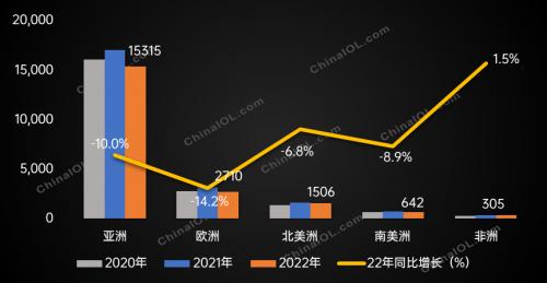2020-2022年全球冰箱冷柜分区域生产走势(万台)