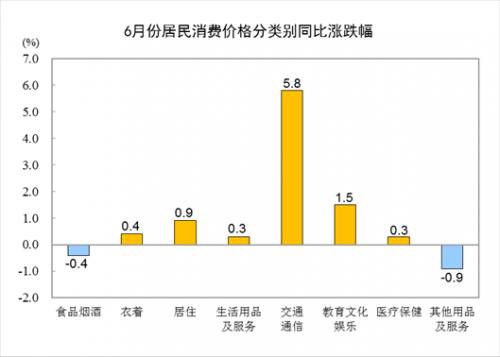 其他七大类价格同比六涨一降。其中,交通通信、教育文化娱乐、居住价格分别上涨5.8%、1.5%和0.9%,衣着、生活用品及服务、医疗保健价格分别上涨0.4%、0.3%和0.3%;其他用品及服务价格下降0.9%。