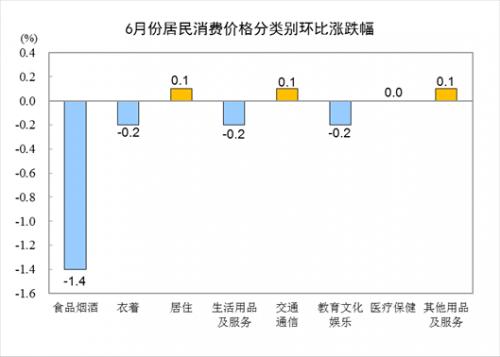 6月份,食品烟酒类价格环比下降1.4%,影响CPI下降约0.39个百分点。食品中,畜肉类价格下降7.6%,影响CPI下降约0.27个百分点,其中猪肉价格下降13.6%,影响CPI下降约0.22个百分点;鲜果价格下降4.5%,影响CPI下降约0.08个百分点;鲜菜价格下降2.3%,影响CPI下降约0.04个百分点。