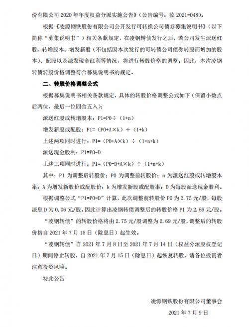 凌源钢铁股份有限公司关于利润分配调整可转债转股价格的提示性公告