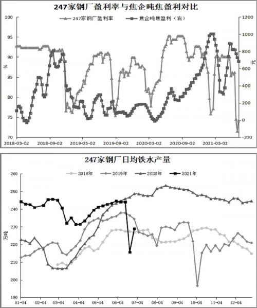 需求方面,近期粗钢减量预期持续“发酵”,对原材料市场扰动增加。据相关机构调研,目前,部分省份及部分国有钢铁企业已陆续推出压减粗钢产量的计划,同时个别钢厂将同步压减生铁产量,压减措施包括暂停个别高炉运行、降低生产负荷、对高炉进行为期3~5个月的检修等等,另有部分钢厂已开始减产,但还没有明确减产时间与减产量,具体政策仍有待持续跟踪。上周数据显示,247家钢厂高炉日均铁水产量为228.9万吨,环比回升13.27万吨,同比下降19.77万吨。若下半年粗钢减量政策严格执行,焦炭需求将较上半年或去年下半年有较大幅度的回落,需持续关注钢厂限产政策变化。