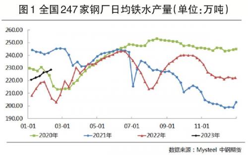 需求方面,短期受终端需求羸弱及钢厂利润薄弱的影响,铁水产量持续小幅回升,但整体仍处于偏低区域,终端需求复苏力度将决定铁矿石需求回升力度。短期内由于春节假期钢厂库存消耗较多且库存水平显著低于同期,后期存在一定补库需求。但在钢厂利润和市场成交量均偏低格局下,补库空间较小,叠加废钢供应速度较快,一定程度上抑制了铁矿石需求。中期来看,房地产需求仍停留在预期层面,销售端回暖向房地产开工端传导的周期较长,现实需求改善空间较小,铁矿石中期需求难言乐观。截至2月10日,全国247家钢厂高炉开工率为78.42%,周环比增长1.01%,同比增长10.23%;高炉炼铁产能利用率为84.93%,周环比增长0.60%,同比增长8.36%;钢厂盈利面为38.53%,环比扩大4.33%,同比减小43.72%;日均铁水产量为228.66万吨,环比增加1.62万吨,同比增加22.62万吨(见图1)。