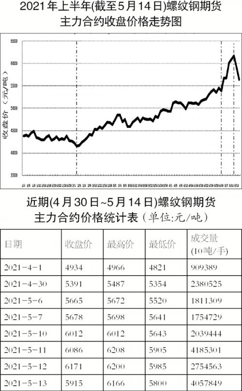 5月开市以来,螺纹钢期货价格经历了史上从未有过的大起大落。首先是价位高,不断刷新历史纪录;其次是变化快、幅度大,价格在短期内“触顶”“跌停”。与此同时,业内情绪涨落起伏,由上旬的“热得发烫”骤变成中旬的“冷得发抖”,前后行情“冰火两重天”,市场“神经”经历着两个极端的考验。
