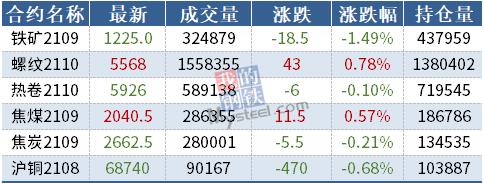 ◎螺纹钢涨0.78%、热卷跌0.10%