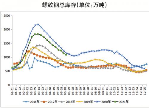 根据相关机构周度数据,截至5月20日,螺纹钢总库存为1083.54万吨,周环比下降54.59万吨;热轧卷板总库存为347.08万吨,周环比下降2.52万吨。螺纹钢、线材、热轧卷板、冷轧卷板、中厚板等五大钢材品种总库存为2040.71万吨,周环比下降72.28万吨。以季节性较强的螺纹钢为例,5月14日~5月20日的去库存速度较5月7日~5月13日下降近一半,说明库存消化放缓。即使不排除有偶然性在其中,但笔者认为未来一段时间,随着各地入夏,雨季来临,螺纹钢将经历库存下降放缓、小幅库存累积、再次去库存的过程。
